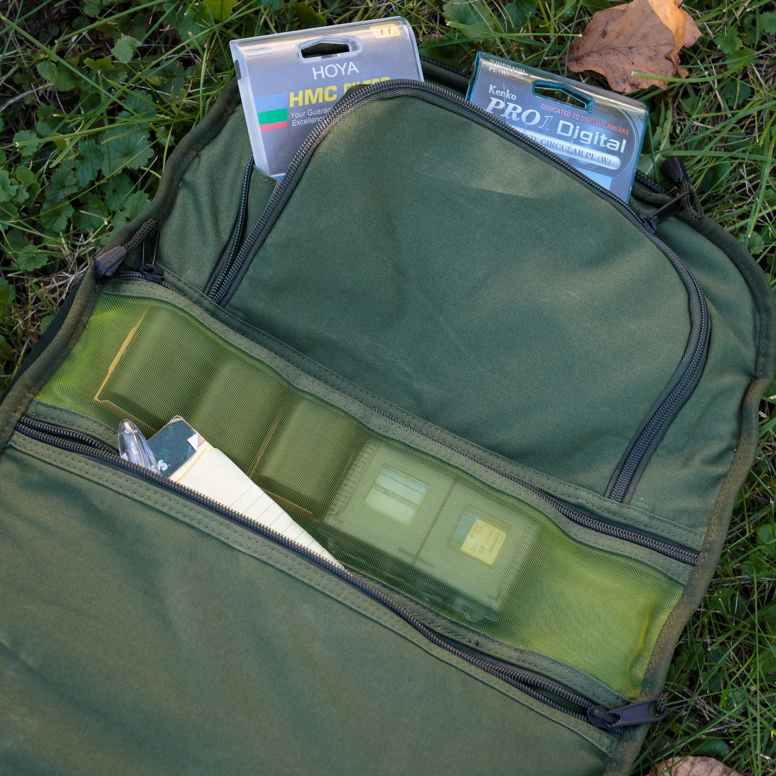 The pockets on the inside flap are sufficient for storing filters, memory cards, batteries, and other small accessories. The narrow, see-through, central pocket is perfect for a memory card case and few LP-E6 batteries. It would be nice to see some additional organization, like pen holders or an attachment for keys.